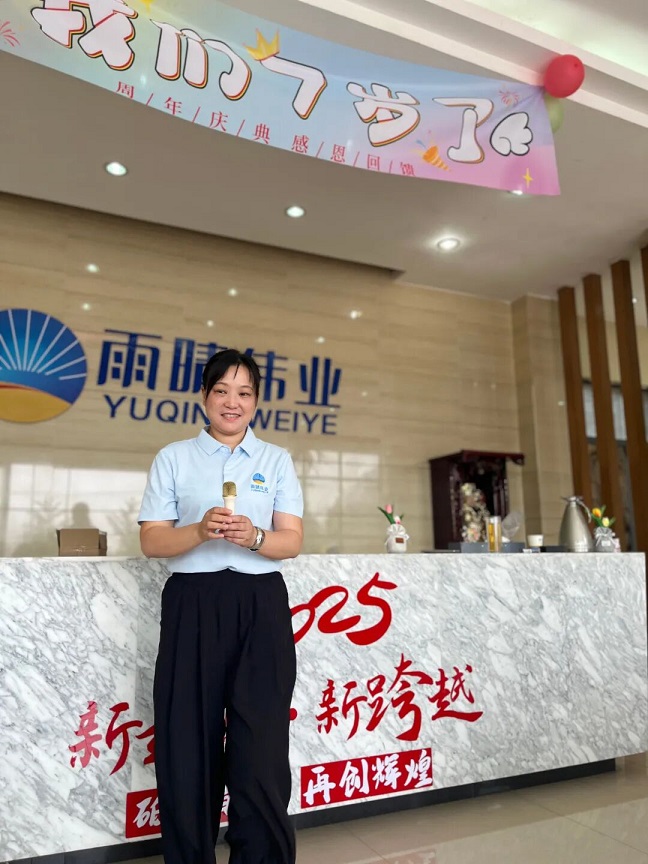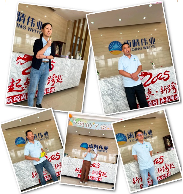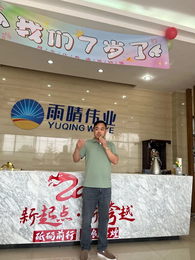 04领导致辞,回顾展望未来在热烈的掌声中,雨晴伟业的董事长李明臣走上舞台,发表了精彩的致辞。领导首先对公司成立 7 年来的发展历程进行了回顾,从最初的艰难创业,到逐步在市场中站稳脚跟,再到如今成为行业内的知名企业,每一个阶段都充满了挑战与机遇。李总表示,这 7 年是全体雨晴人共同努力的结果,正是因为大家的坚持与付出,才有了今天的雨晴伟业。同时,领导也对公司未来的发展提出了新的目标与规划,鼓励大家继续保持拼搏精神,为实现公司的愿景而努力奋斗!